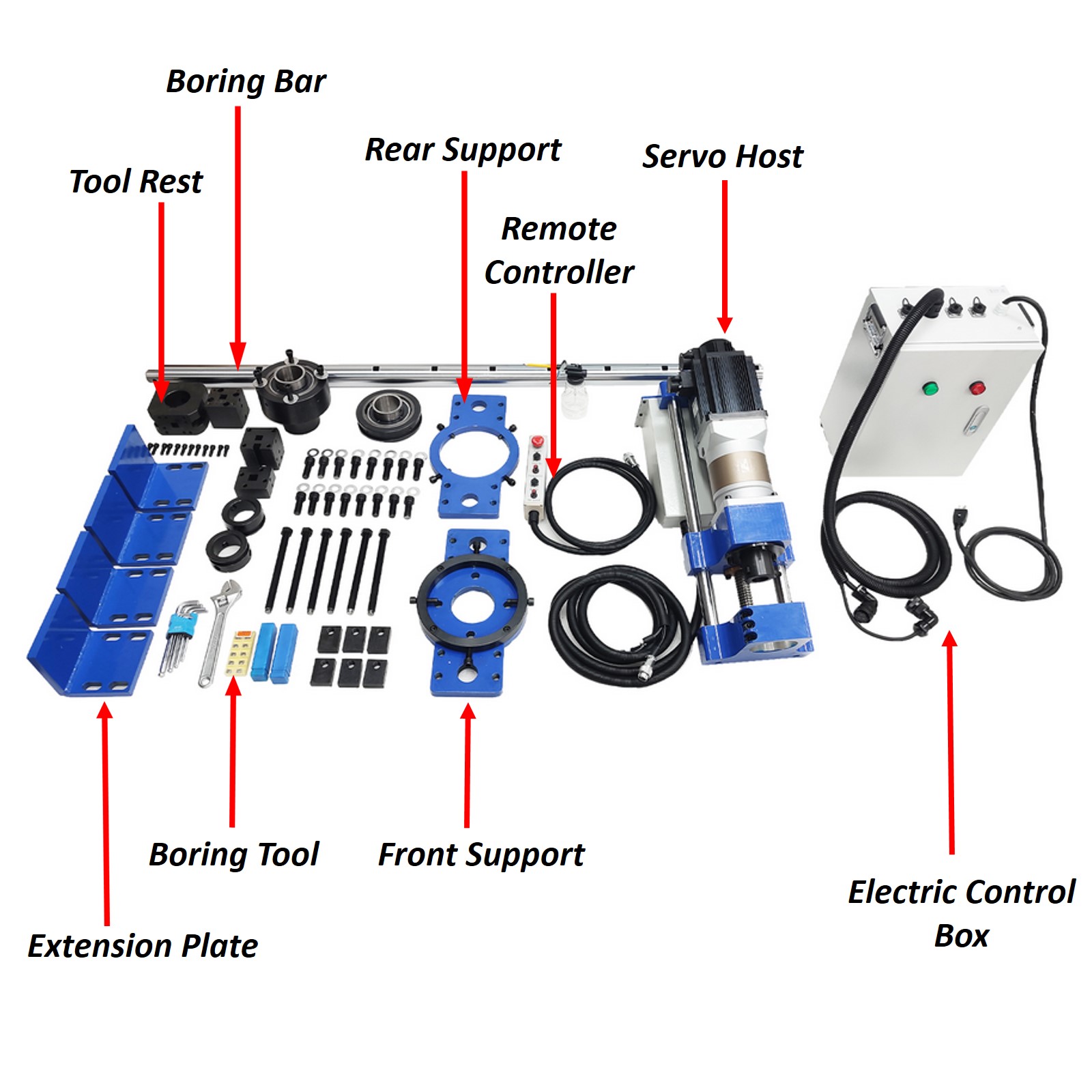 The electric control box is designed for the boring machine, the structure is compact, internal circuits are arranged orderly, and the circuit safety is effectively ensured. The motor controller is equipped with a dynamic delay braking device to avoid vibration during parking.   The tool rests can be installed and fixed at any position within the effective travel range. Different tool rests can be selected to adapt to different workpieces, so that the adaptability is higher. The tool rests are firm and durable and convenient to replace.