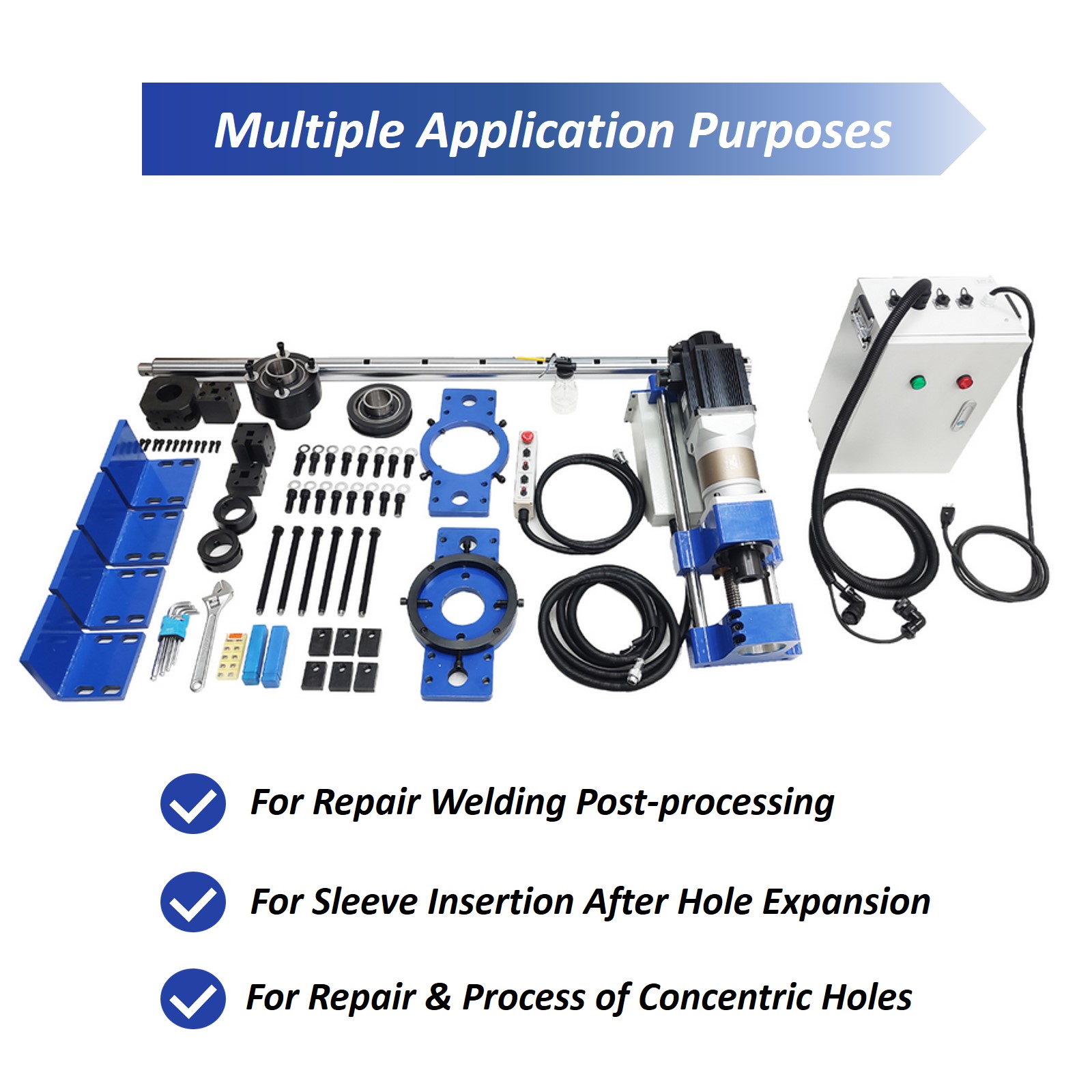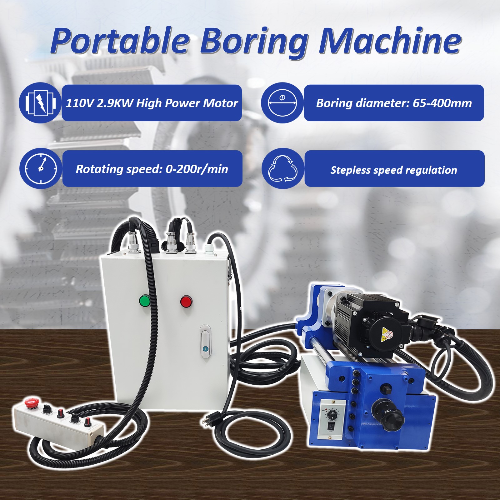 The boring machine is mainly used for repair welding post-processing of shaft pin holes, rotary holes and hinge holes in various engineering machinery structures, or used for inserting sleeves after expanding holes. It is also used for repairing and processing the concentric holes of excavators, loaders, cranes and other machinery. The boring machine can process parallel holes in multiple rows, and conducts one-time positioning processing on the multiple holes to ensure the coaxiality of the multiple holes.   The 110V motor is adopted by the spindle and supporting tools of the boring machine and has the characteristics of low rotating speed and high torque. The whole machine can achieve stable cutting processing and has superior performance. Axial movement and cutting performance are free of vibration. The important guarantee is provided for high precision, high efficiency, high stability and high flexibility boring machining. The stability is better, and the fault rate is lower.